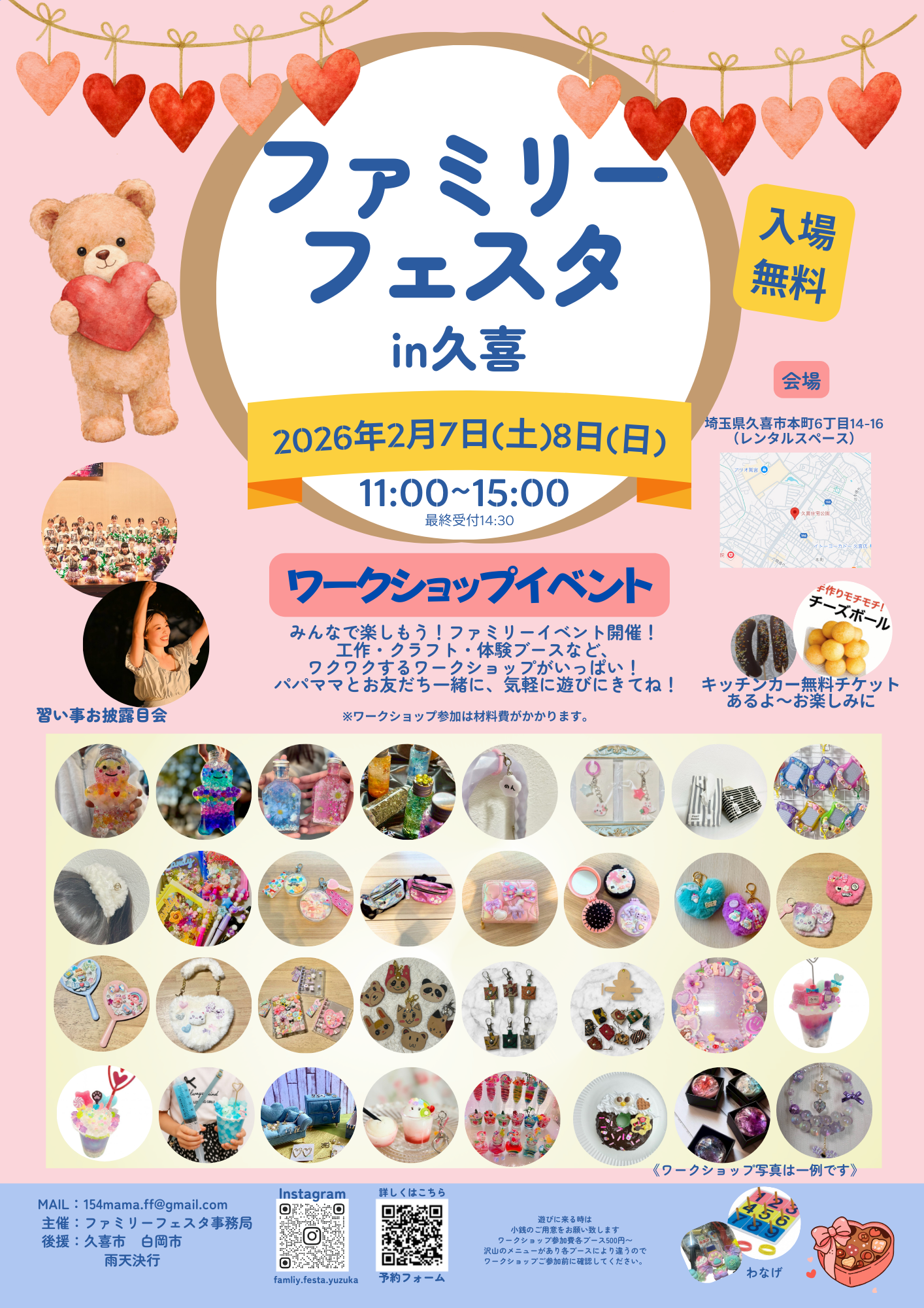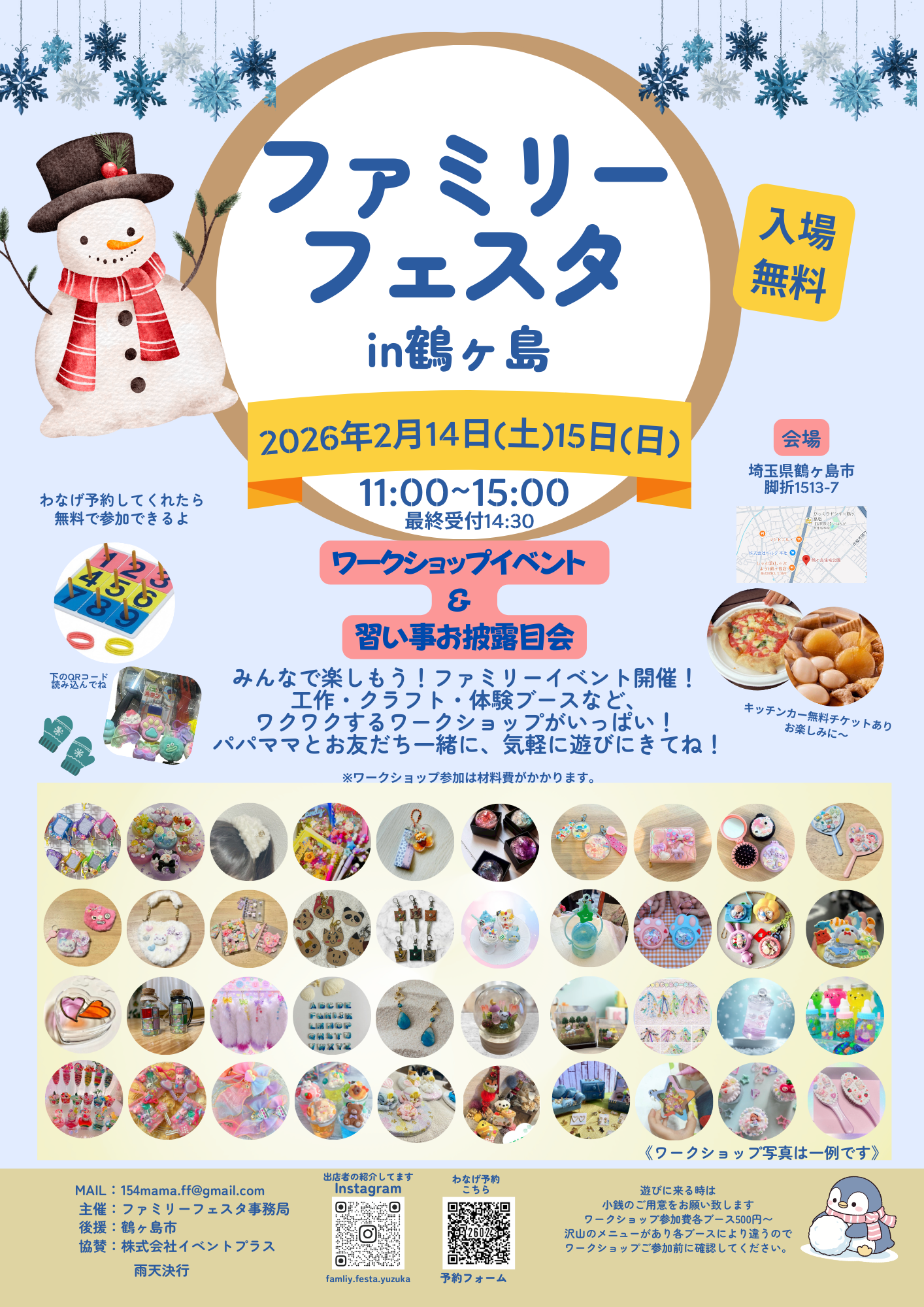 イベント一覧 【鶴ヶ島】ピザ窯で本格ピザづくり体験|2026年2月23日(月祝) 西部(川越・… 【鶴ヶ島】ファミリーフェスタで話題の3大ワークショップを無料体験!|2026年2月22日(日) 西部(川越・… 【鶴ヶ島】ファミリーフェスタin鶴ヶ島|2026年2月14日(土)&15日(日) 西部(川越・… 【鶴ヶ島】味噌づくり体験|2026年2月8日(日) 西部(川越・… 【久喜】味噌づくり体験|2026年2月23日(日) 東部(春日部… 【久喜】ファミリーフェスタで話題の3大ワークショップを無料体験!|2026年2月22日(日) 東部(春日部… 【久喜】ピザ窯で本格ピザづくり体験|2026年2月15日(日) 東部(春日部… 【久喜】ファミリーフェスタin久喜|2026年2月7日(土)&8日(日) 東部(春日部… 【浦和】ファミリーフェスタ番外編!キッズワークショップフェア|2026年1月10日(土)&12日(月祝) 中央(さいた… 【川口】ごちゃまぜフェスティバル in 川口|2025年11月29日(土) 中央(さいた… 【さいたま市プラザ浦和】夏の化学実験教室|2025年7月13日(日) 【久喜】浴衣甚平プレゼント|2025年8月3日(日) 東部(春日部… 【川口市・蕨市】お菓子リュックづくり|2025年6月15日(日) 【川口市鳩ヶ谷】あの大人気倉庫型ストアの大容量アイテムが当たる!日用品抽選会|2025年6月15日(日) 【川口市鳩ヶ谷】トイカメラづくり|2025年7月13日(日) 中央(さいた… 【さいたま市浦和】大工さんになりきってガーランドを作ろう|2025年4月26日(土) 【川口市・蕨市】大工さんなりきってスマホスタンドを作ろう|2025年5月4日(日) 中央(さいた… 【さいたま市】無料のコーナーからワンコインで楽しめるワークショップも目白押し!ファミリーフェスタin浦和|2025年5月11日(日) 【川口市鳩ヶ谷】キッチンカー体験|2025年5月11日(日) 【鳩ヶ谷】クーポンあり!入場無料!大人気のファミリーフェスタin鳩ヶ谷|2025年5月18日(日) 1 / 1312345...10...»最後 » エリアを選択 北部(本庄・熊谷) その他 埼玉 東松山 秩父(秩父・小鹿野) 東部(春日部・越谷・久喜) 西部(川越・所沢・鶴ヶ島) 中央(さいたま・川口) 人気のキーワード 参加無料 駐車無料 親子で参加 オンラインイベント バーベキュー場 吹きガラス体験 フルーツ狩り DIYワークショップ 新しい生活様式 ピザ作り体験 職業体験 自転車教室 光るどろだんご 子ども撮影会 動物イベント プログラミング 赤ちゃんイベント お菓子の家 ハーバリウム ポーセラーツ キャンドル お絵かき 手形足型アート ウニランプ ハンモック お菓子リュック ウッドバーニング アイシングクッキー 食品サンプル 恐竜 入学入園 卒業卒園 新生活 桜 春休み ゴールデンウィーク こどもの日 母の日 梅雨 父の日 夏休み 水遊び 花火ができる場所 自由工作 自由研究 七夕 カブトムシ クワガタ 水遊び 花火できる場所 紅葉ライトアップ 親子で防災 お月見 七五三 クリスマス イルミネーション お菓子の家 お正月 バレンタイン ひな祭り ホワイトデー